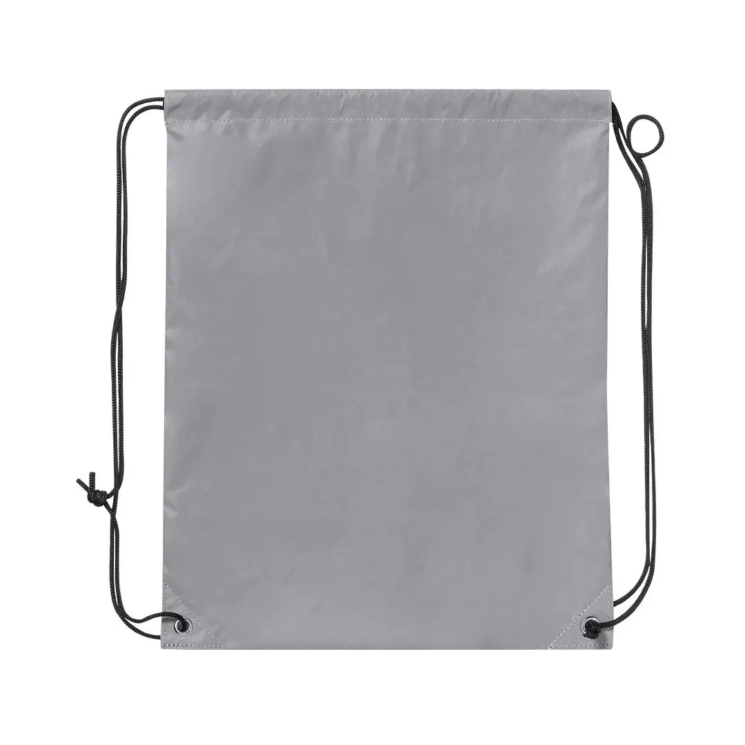 Saco-mochila de suave poliéster 210T. Fabricada utilizando tecido com grande capacidade para refletir intensamente a luz, graças a milhões de pigmentos refletores e baseando-se no princípio da retro-reflexão da luz, uma propriedade de visibilidade nocturna que consiste na refração da luz desde a fonte de origem da mesma. Com cordões de fecho de cor preta e argolas metálicas. Resistência até 7kg de peso e resistente à água.