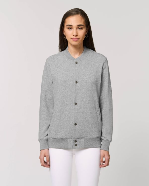 La chaqueta bomber unisex. Corte normal, Cuello redondo, Long Sleeve, Felpa no perchada. Manga pegada Cuello en canalé 1x1 Bies interior de espiga en el cuello Media luna interior en tejido principal Botones de metal en zona frontal Bolsillos de ojal en la delantera Canalé 1x1 en puños y bajo Puntada doble en hombros, puños y bajo