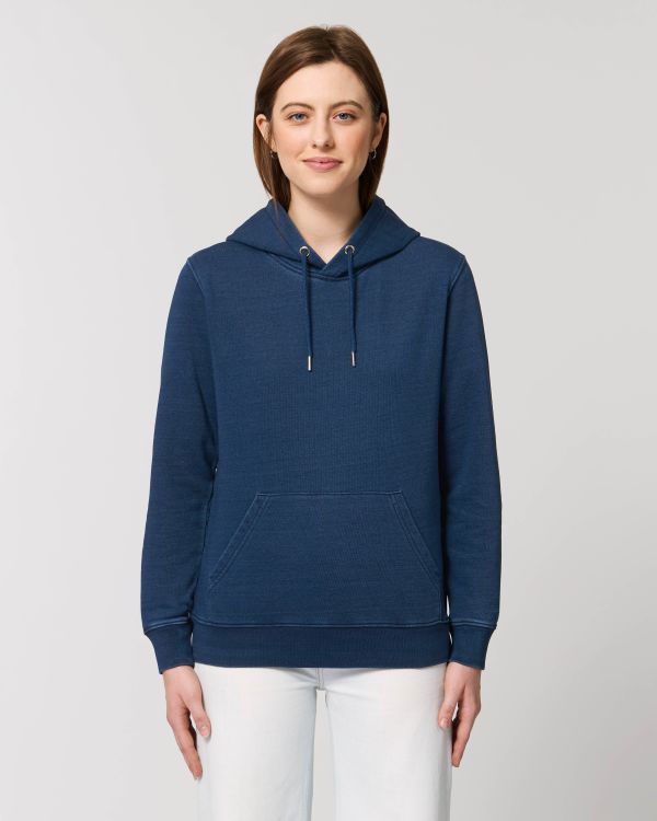 La sudadera denim con capucha unisex . Corte normal, Cuello redondo con capucha, Long Sleeve, Felpa no perchada. Manga pegada Capucha forrada en tejido principal Cordón redondo, en el mismo tono, rematado con extremos de acabado metálico Ojales metálicos Bies interior de punto de jersey en el cuello Media luna interior en tejido principal Puntada simple en cuello y en la abertura de la capucha Canalé 1x1 en puños y bajo Puntada doble en hombros, puños y bajo Bolsillo canguro Efecto desgastado en todas las costuras Prenda teñida con índigo, la apariencia de cada prenda puede variar, el color puede borrarse, siga nuestra etiqueta de cuidado Lea cuidadosamente las recomendaciones de impresión