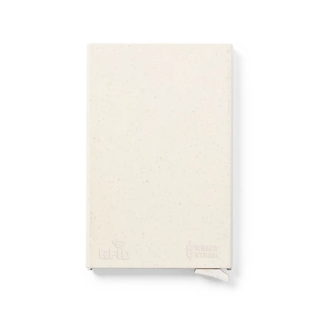 Porta-cartões de linha nature fabricado em palha de trigo. Capacidade até 6 cartões, com engenhoso mecanismo, desliza e extrae o accesso aos cartões. Tecnologia de segurança RFID (Identificação por Radio Frequência) que mantém seguros os seus dispositivos de transmissão de identidade. Distintivos RFID e palha de trigo injectado no molde. A palha de trigo fomenta a utilização de matérias-primas naturais, reduzindo assim as emissões poluentes.