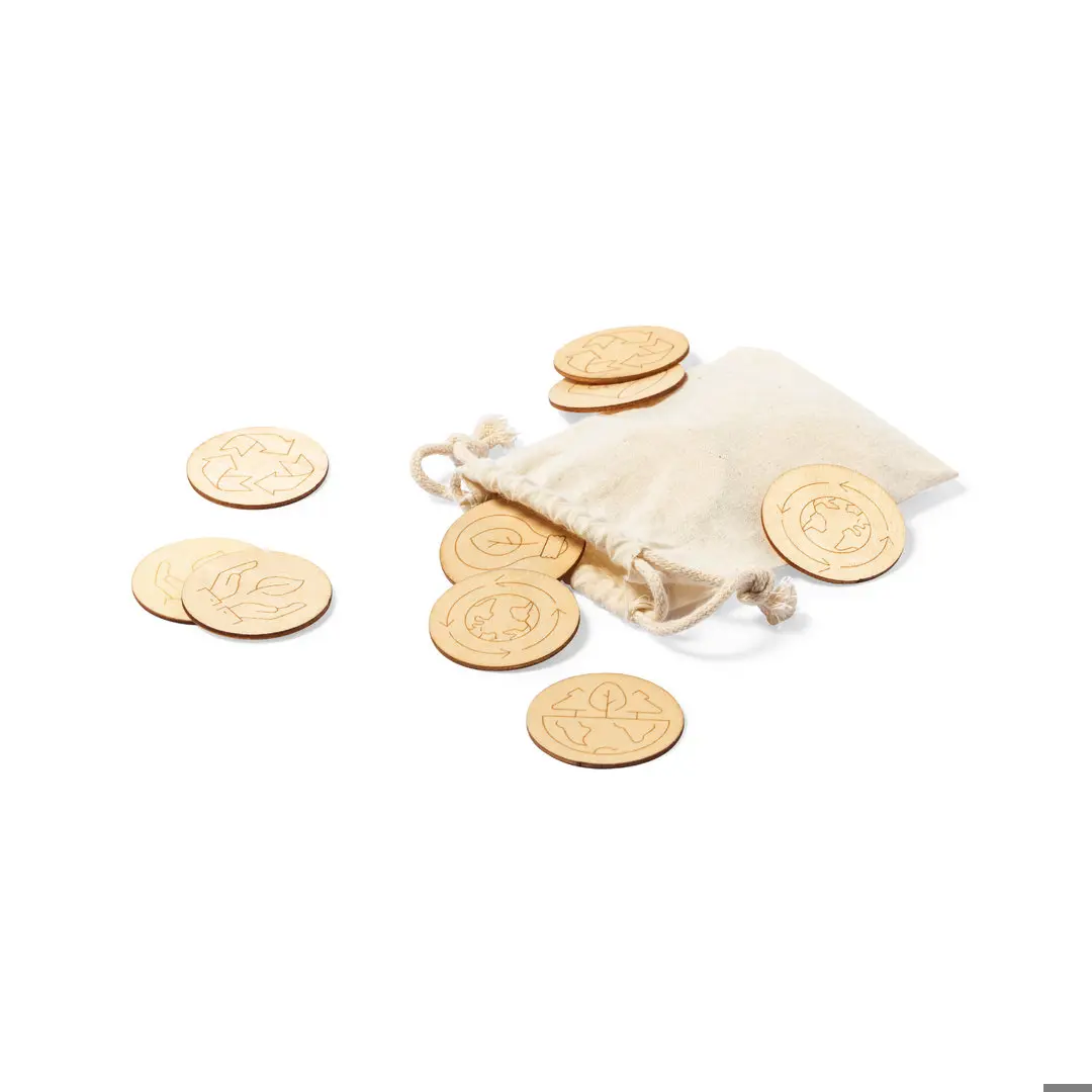Jogo de sensibilização ecológica fabricado em madeira. Conjunto de 24 peças em bolsa de transporte 100% algodão com cordões de fecho a condizer.