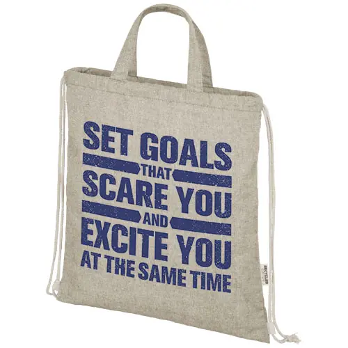 Mochila com cordões feita de uma mistura de 150 g/m² de algodão e poliéster reciclados. Grande compartimento principal com fecho de cordão de algodão em cor natural. O algodão reciclado é produzido a partir de resíduos pré-consumo gerados pelas fábricas têxteis durante o processo de corte. Cores semelhantes são misturadas, para que não seja necessário nenhum tingimento adicional. Devido à natureza do algodão reciclado, pode haver ligeiras variações na cor. Esta característica contribui para uma aparência mais autêntica. Cada mochila também vem com um rastreador "Aware™". Esta funcionalidade inovadora permite aos utilizadores rastrear as origens e o percurso do seu artigo através de um código QR, aumentando a transparência na cadeia de abastecimento e promovendo uma ligação mais forte entre o produto e o seu processo de produção. Resistência até 5 kg de peso. Comprimento da alça: 14 cm.