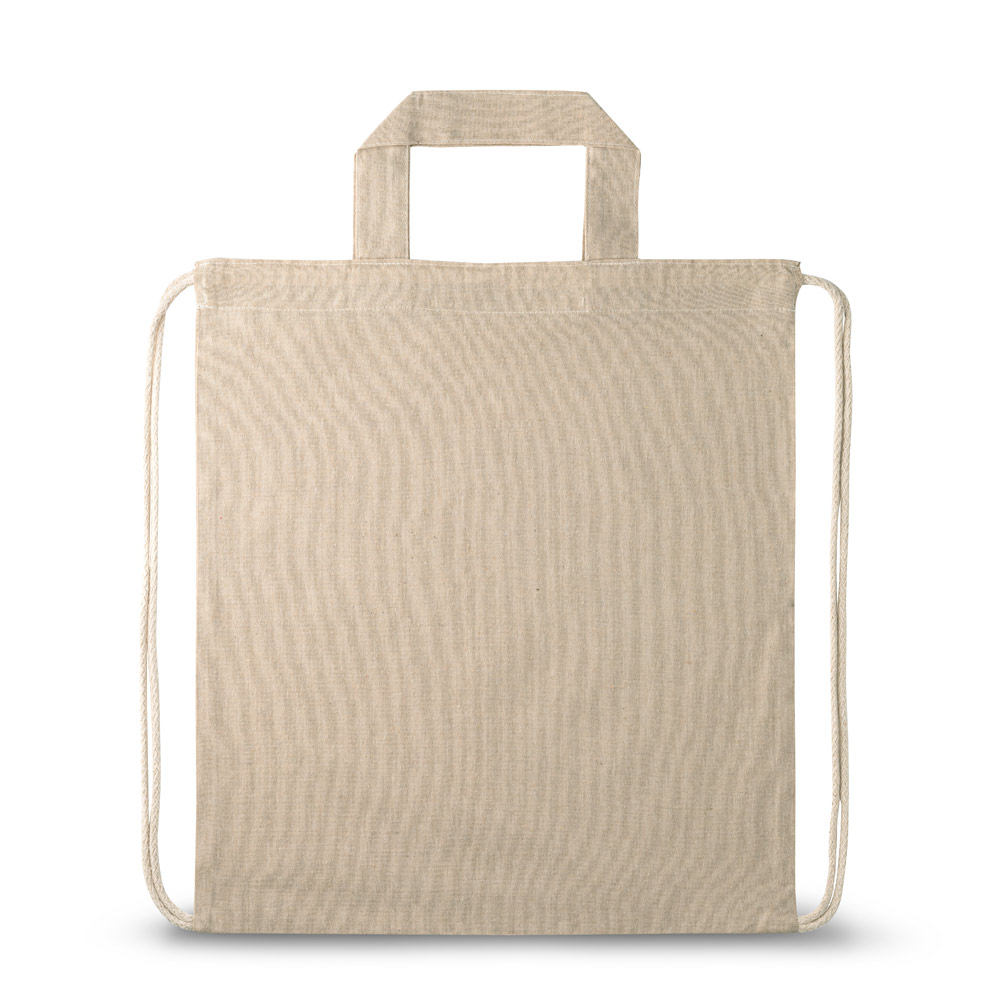 Saco tipo mochila em algodão reciclado (140 g/m²) com alças de 30 cm e cordões em algodão para fechar.370 x 410 mm