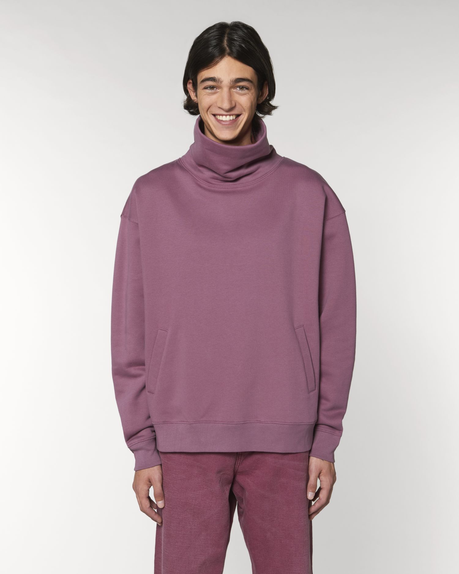 La sudadera de cuello chimenea unisex. Extragrande, Cuello vuelto, Long Sleeve, Felpa perchada. Manga pegada Hombros caídos Cuello forrado en tejido principal Bies interior de punto de jersey en el cuello Canalé 1x1 en puños y bajo Media luna interior en tejido principal Puntada doble en hombros, cuello, puños y bajo Dos bolsillos de ojal en la zona delantera