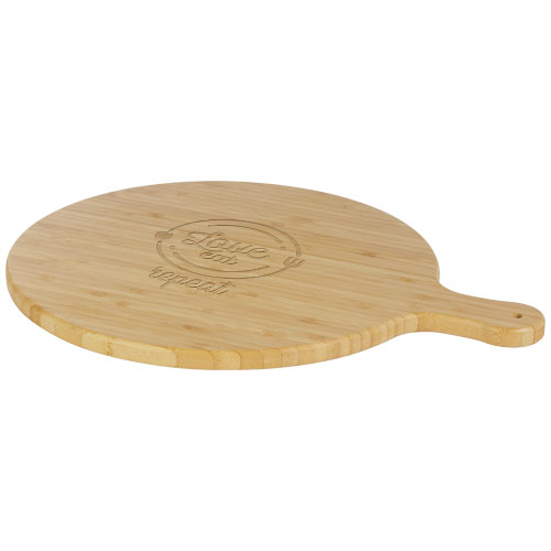 A tábua de corte "Delys" é feita de bambu, ideal para indivíduos e empresas que optam por uma escolha mais sustentável. Diâmetro da tábua: 30,5 cm. Comprimento do cabo: 8 cm. Espessura da tábua: 1,4 cm. Não adequada para micro-ondas ou máquina de lavar louça.