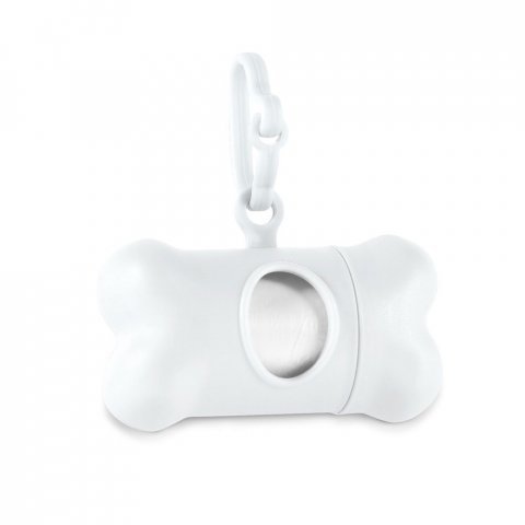 Dispensador de sacos higiénicos em PP com 20 sacos higiénicos em PE para cão. Dispensador em formato de osso.Fechada: 111 x 21 x 15 mm
